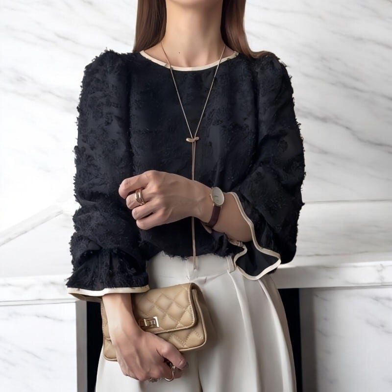 首周り、袖口にバイカラーのパイピングをあしらった、可愛らしいブラウスです。