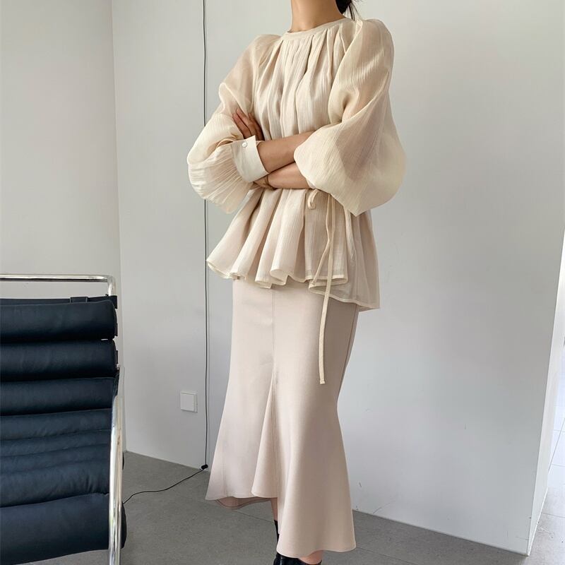 柔らかな透け感のあるシフォン生地のチュニックブラウス。