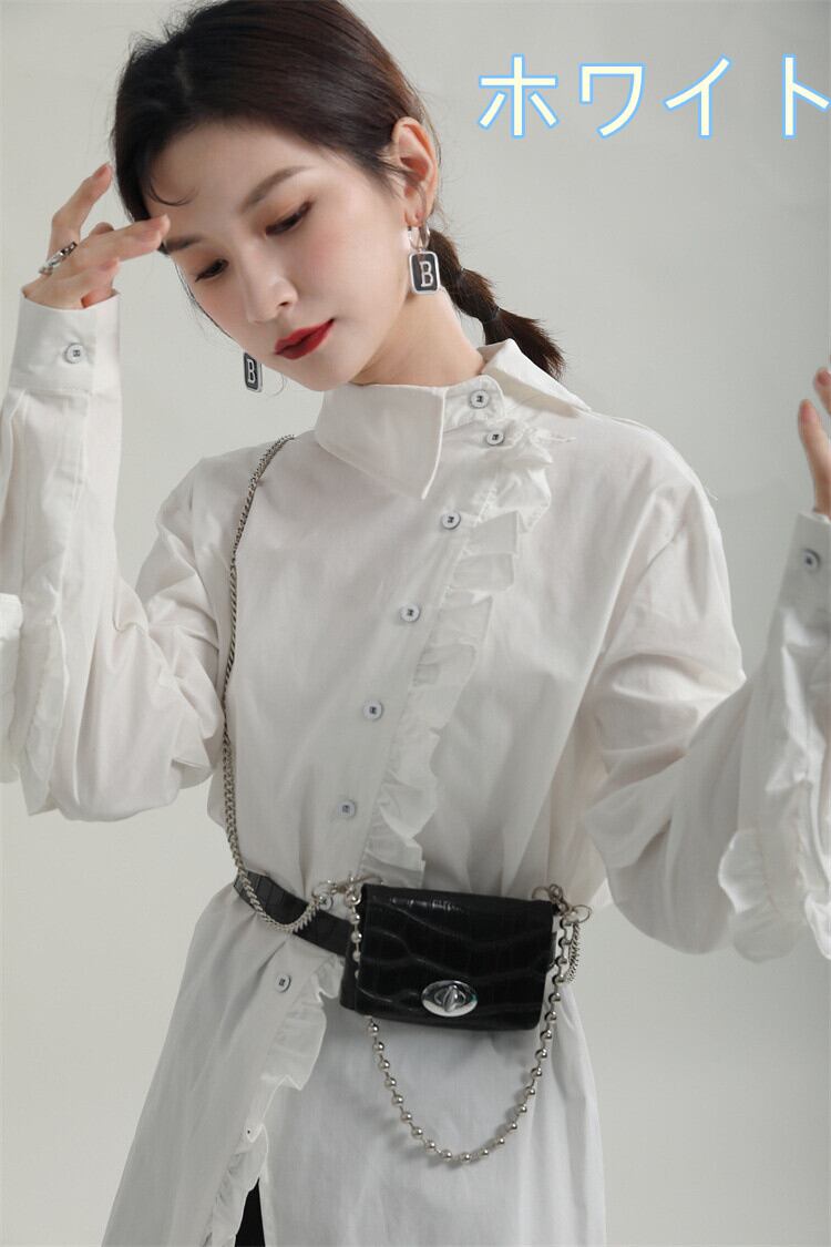 斜めの前たてにフリルのついた、華やかなブラウスです。