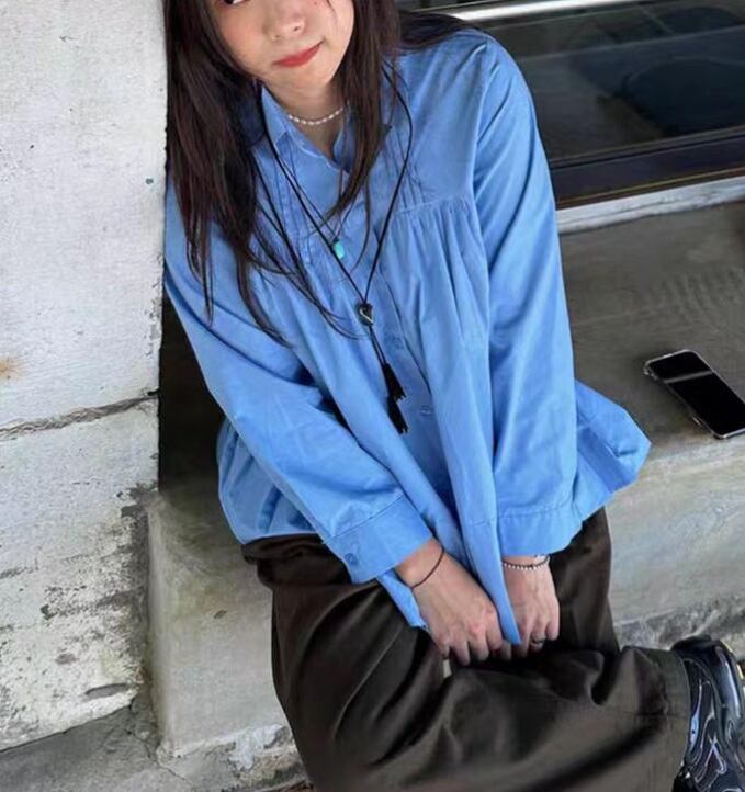 胸元のギャザーと裾のプリーツ切替デザインが、女性らしいシルエットを演出します。